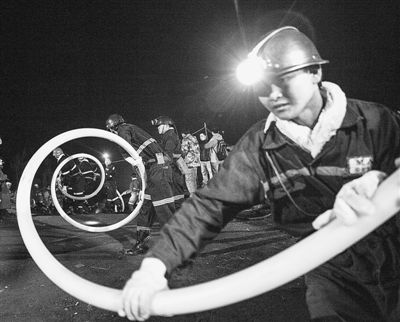 8日凌晨,救援人员在下海子煤矿安装水管进行井下排水。 |