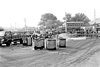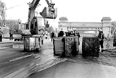 正在现场指挥铲车作业的一位先生告诉北京青年报记者,这些盐酸洒落在路面长度有15米左右,宽度大约2-3米。除了用水稀释外,他们还将石灰和沙子石铺撒在路面上,主要目的就是吸附那些被稀释后的盐酸溶液,减少其渗入地下而对周边环境造成进一步影响。