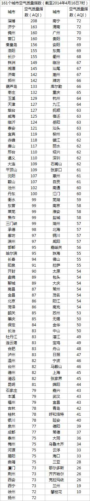 说明:自2014年1月1日起,环保部发布空气质量实时信息、空气质量月报及参与空气质量排名的地级城市已由74个增加到161个,包含了直辖市、省会城市、计划单列市、“三区”所有地级城市、环保重点城市和环保模范城市。人民网环保频道将采用环保部的官方数据,对161个城市每日空气质量进行排行。(实习生 朱宁君)