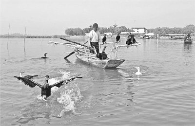 5月17日,渔民在河北安新县白洋淀文化苑景区水域用鸬鹚打鱼。记者从安新县政府获悉,近期白洋淀水位大沽高程8.73米,蓄水量4.298亿立方米,白洋淀有水面积295.638平方公里,创下1996年以来同期最高水位值。白洋淀作为华北地区最大的淡水湖泊,在调节周边地区气候、保持生物多样性和珍稀物种资源、补充周边地区地下水等方面,具有不可替代的生态功能。