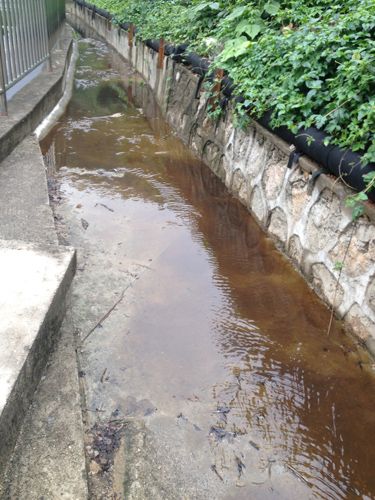 ③下坪填埋场渗滤液处理设施后面的排水沟,红褐色的污水直接进入地下排水管道。