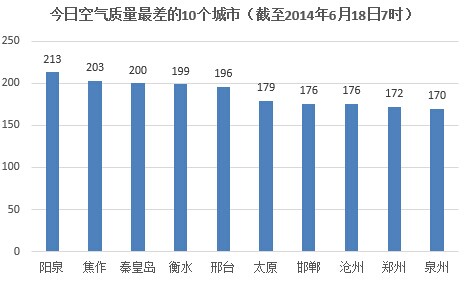 人民网北京6月18日电 (蒋琪)根据环保部公布的最新数据,截至今日早上7时,阳泉的AQI(空气质量指数)为213,属于重度污染,成为161个参与空气质量排名的城市中空气质量最差的城市。今日空气质量最差的10个城市分别是阳泉、焦作、秦皇岛、衡水、邢台、太原、邯郸、沧州、郑州、泉州。其中秦皇岛、衡水、邢台、邯郸、沧州五城属于河北省。