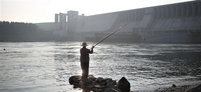 7月6日,湖北丹江口水库大坝下游,老人在江边钓鱼。南水北调中线工程已经进入全线通水倒计时。新京报记者 侯少卿 摄