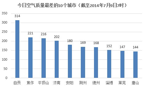 人民网北京7月9日电 (记者蒋琪)根据环保部公布的最新数据,截至今日早上7时,自贡的AQI(空气质量指数)为314,属于六级严重污染,成为161个参与空气质量排名的城市中空气质量最差的城市。今日空气质量最差的10个城市分别是自贡、焦作、平顶山、济南、安阳、荆州、德州、淄博、莱芜、唐山。其中自贡、焦作、平顶山、济南等4个城市是重度及以上污染。