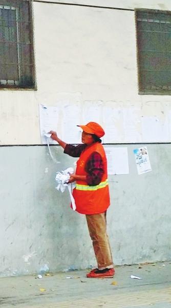 昨日下午3时,农业路与文化路口西约200米路南,一名环卫女工正在撕张贴在临街墙上的“广告”,因为粘得太牢,清理起来并不容易。