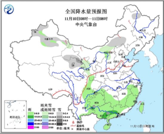 随着冷空气自西向东行进的步伐,今日,除新疆北部外,青海北部、甘肃中部、内蒙古中部等地的部分地区也会降下小到中雪或雨夹雪;与此同时,新疆东部、甘肃中西部、内蒙古等地还会刮起4~6级风。明天起,冷空气继续东移,东北地区将迎来较大范围的雨雪大风天气。
