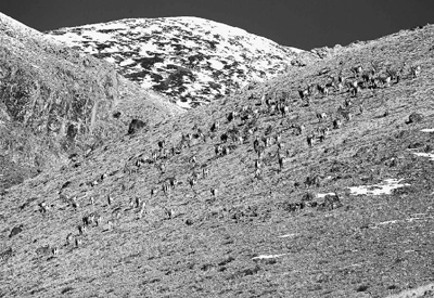 北山羊属国家一级保护动物,在我国主要分布于新疆、甘肃西北部、内蒙古西北部等地,栖息于海拔3500至6000米的高原裸岩和山腰碎石嶙峋地带,冬天也不迁移到低地,为栖居位置最高的哺乳动物之一。进入11月份后,平日分群生活的北山羊开始合群生活,准备繁育后代。