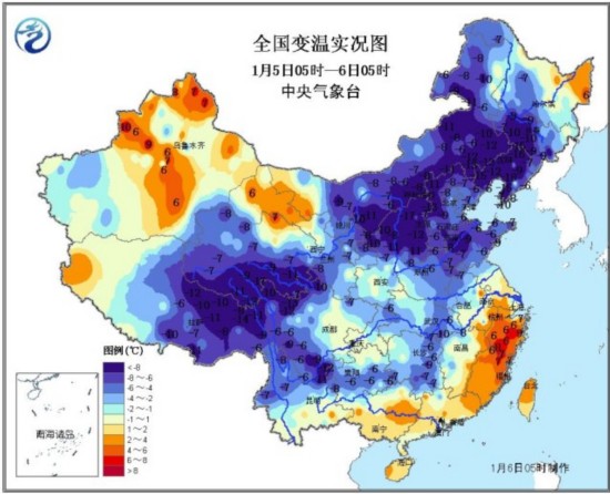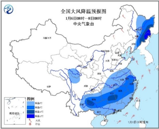中央气象台今晨继续发布寒潮蓝色预警:受强冷空气影响,预计6日08时至8日08时,东北地区、黄淮及其以南大部地区气温普遍下降6~10℃,其中,吉林中东部、黑龙江东南部以及贵州西部、湖南东南部、江西西南部等地降温幅度可达10~12℃;上述部分地区并伴有4~6级偏北风,江河湖面风力可达5~7级。渤海、黄海、东海以及南海东北部将有7~8级大风,阵风9级。另外,青藏高原东部气温也将下降6~8℃。预计南方地区的最低气温将出现1月8日清晨。