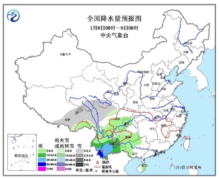8日08时至9日08时,西藏中东部、青海东南部、川西高原、云南西北部和东北部、贵州西北部的部分地区有小雪或雨夹雪,局地中雪;西南地区、华南西部等地的部分地区有小到中雨,其中云南西南部有大雨,局地暴雨(50~70毫米)。台湾海峡、南海东北部和中部将有7~8级、阵风9级的东北风。