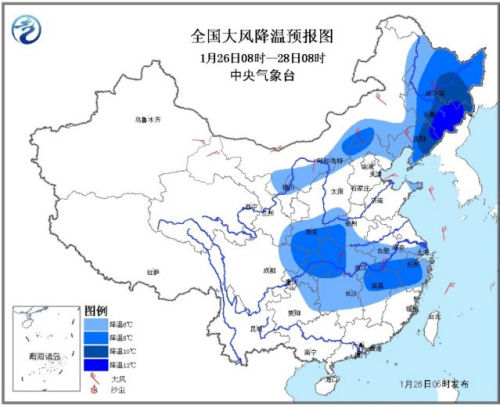 中新网1月26日电 据中央气象台消息,受较强冷空气影响,未来三天,新疆北部、甘肃北部、内蒙古、东北、华北、黄淮、江淮、江汉、江南大部、西南地区东部等地气温将下降4~8℃,其中,东北地区中部等地降温幅度可达10~12℃;上述大部地区先后伴有4~6级偏北风,江河湖面风力可达7级,渤海、渤海海峡、黄海将有7~8级、阵风9级大风。