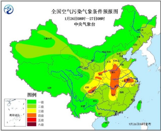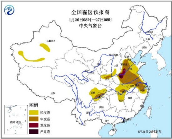 人民网北京1月26日电 (杨翼)26日08时~27日08时,河北南部、陕西关中、河南中东部、山东西部、安徽北部、江苏中西部、浙江北部、四川盆地东南部等8省局地有中度霾,其中河北南部和河南中北部局地有重度霾;另外26日早晨到上午,陕西关中地区、山东西部、河南东部、安徽北部、江苏西部、重庆、湖南西部、江西南部和福建西部等地的部分地区有能见度不足1000米的雾。中央气象台1月26日06时继续发布霾黄色预警。受冷空气影响,从26日白天开始,华北、黄淮、江淮、江汉、江南北部的雾、霾天气自北向南逐渐减弱或消散。