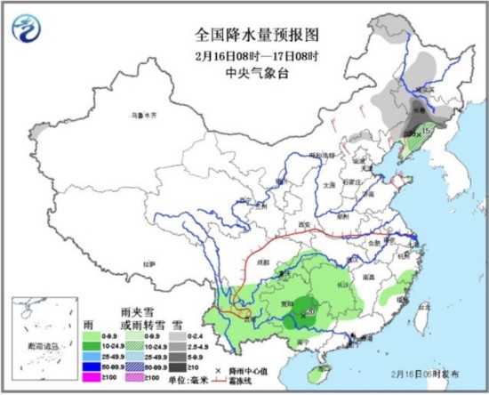 人民网北京2月16日电 (史雅乔)在北方冷空气的影响下,未来三天,东北地区大部、内蒙古地区东部、华北北部等地有小到中雪或雨夹雪,山东半岛有小到中雨,其中辽宁东部、吉林南部等地的部分地区有大雪,局地暴雪;同时,受到南支系统影响,我国南方地区又将迎来大范围降雨天气,预计今天白天到夜间,西南地区东部和南部、华南西部、江南西部等地有小到中雨。