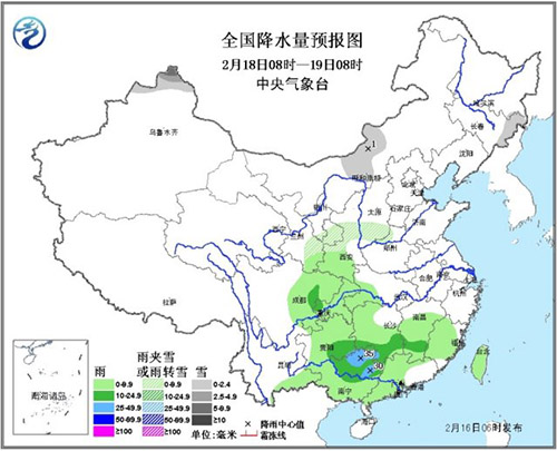 18日08时至19日08时,新疆北部、内蒙古中部、吉林东部、西北地区东部、华北西南部等地有小雪或雨夹雪,其中北疆北部局地有中到大雪;西北地区东南部、西南地区东部、云南东南部、江南西部和南部、华南大部等地有小到中雨,局地有大雨。台湾海峡将有7~8级、阵风9级的东北风。