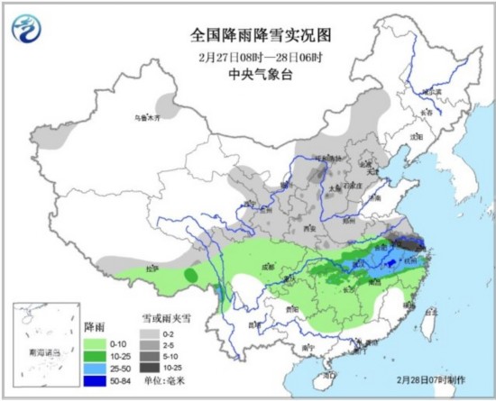 据中央气象台监测,昨日,新疆南疆西部、陕西大部、山西中北部、河北中部、北京东北部、湖北西北部、江苏中部和南部、上海等地出现降雪或雨夹雪,江苏南部和上海北部局地降水量10~25毫米;安徽南部、湖北南部和东部、浙江北部、江西北部、湖南北部、云南西北部等地出现大雨或暴雨,安徽南部和江西东北部局地雨量达60~84毫米。