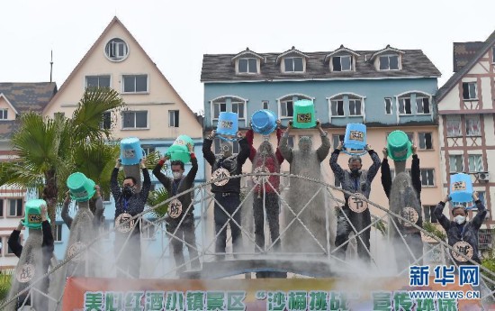 3月1日,在重庆市美心红酒小镇景区,20多名沙桶挑战者将河沙从头顶倒下来,以宣传环境保护。新华社记者 陈诚 摄图片来源:新华网