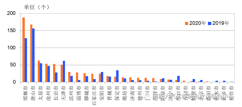 从工业行业上看,主要是钢铁、建材、电厂等企业密集分布的区域。今年春节以来“2+26”城市的工业热高值区数量为848个,同比增加22.4%;邯郸市工业热高值区数量最多(188个),唐山市次之(168个),其次是太原、沧州、长治、天津等市(63-51个),其余城市少于50个(见图2)。这说明,今年春节以来“2+26”城市中部分城市工业活动水平超去年同期。