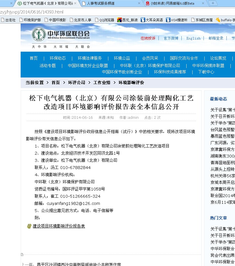 2014年4月,我公司承接了《松下电气机器(北京)有限公司涂装前处理陶化工艺改造项目》(下文简称“松下公司”)的环境影响评价工作。