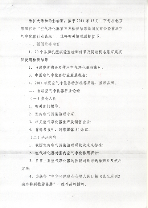 为扩大活动的影响面,拟于2014年12月中下旬在北京组织召开“空气净化器第三方检测结果新闻发布会暨首届空气净化器行业论坛”。具体内容见附件发文。