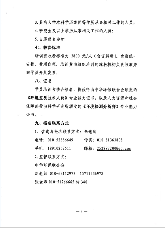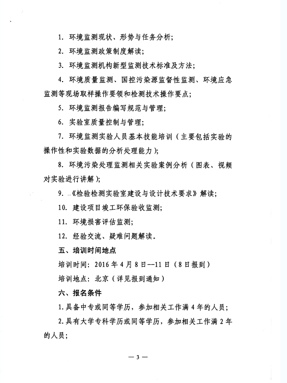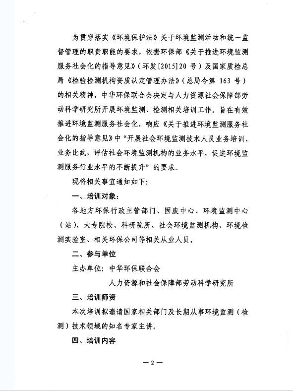 中华环保联合会关于举办《环境监测技术人员》2016年第三期专业能力培训班的通知