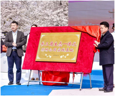 图为中共宝山区委副书记、区长陈杰,中华环保联合会华东办主任陆锡平为“长三角生态一体化顾村公园示范基地”揭牌