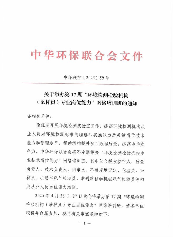 关于举办第17期“环境检测检验机构(采样员)专业岗位能力”网络培训班的通知