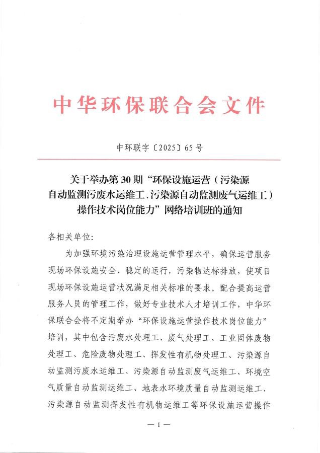 关于举办第30期“环保设施运营(污染源自动监测污废水运维工、污染源自动监测废气运维工)操作技术岗位能力”网络培训班的通知