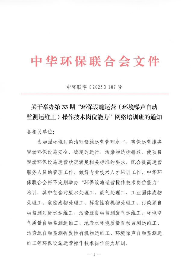 关于举办第33期“环保设施运营(环境噪声自动监测运维工)操作技术岗位能力”网络培训班的通知
