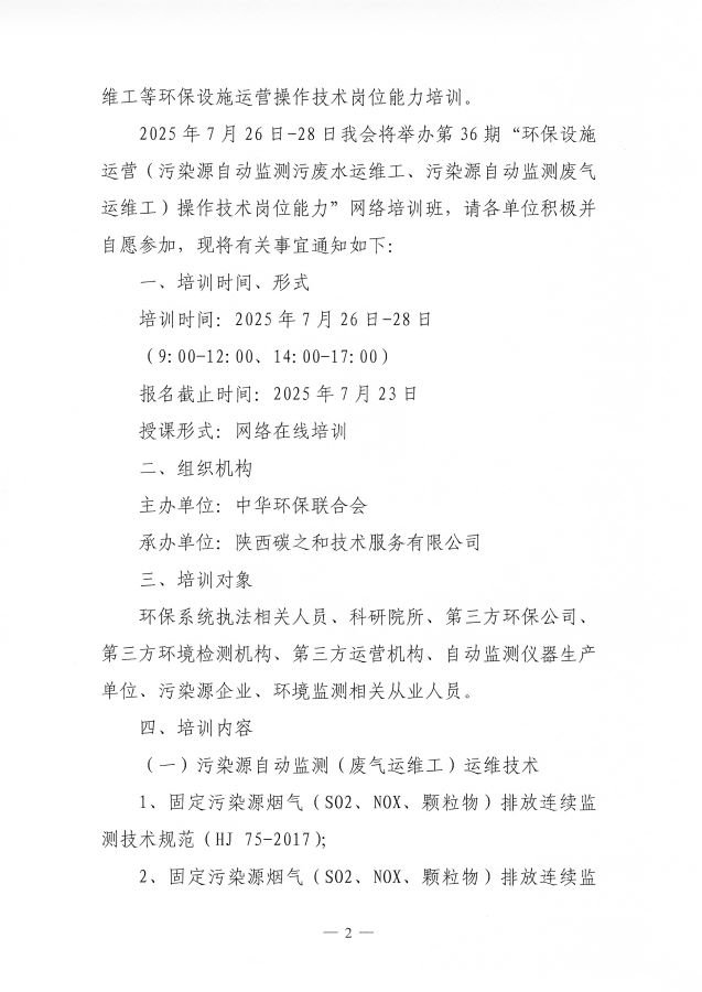 关于举办第36期“环保设施运营(污染源自动监测污废水运维工、污染源自动监测废气运维工)操作技术岗位能力”网络培训班的通知