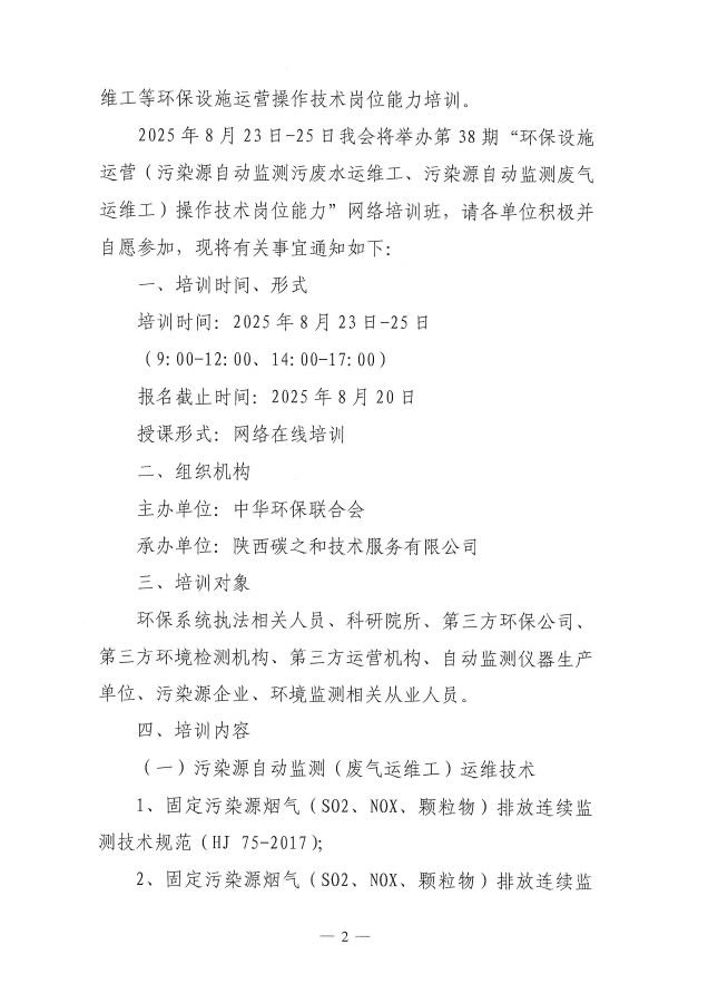 关于举办第38期“环保设施运营(污染源自动监测污废水运维工、污染源自动监测废气运维工)操作技术岗位能力”网络培训班的通知