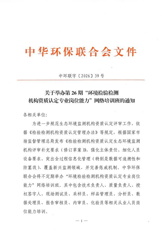 关于举办第26期“环境检验检测机构资质认定专业岗位能力”网络培训班的通知