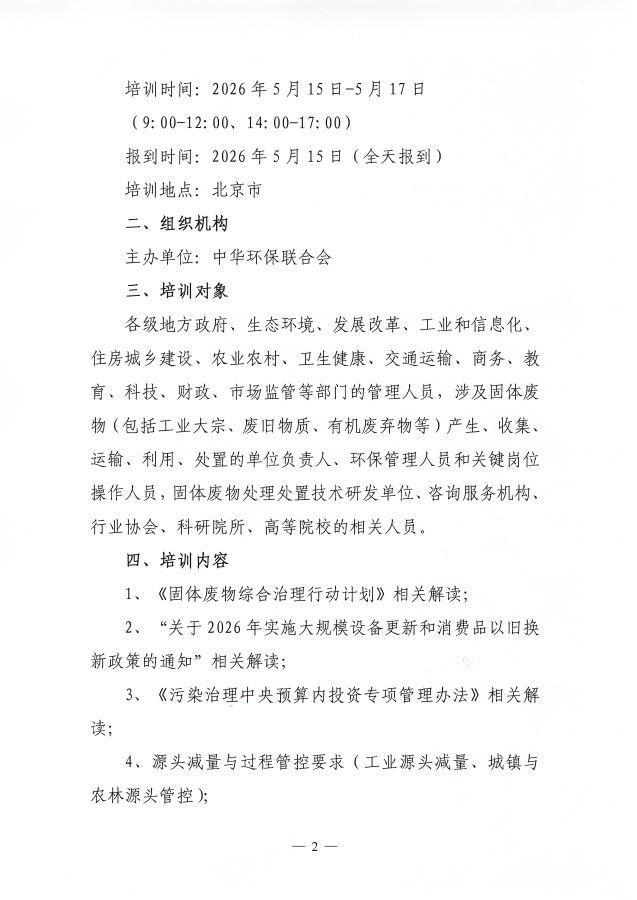 关于举办第2期“固体废物综合治理行动计划”及预算内投资专项管理办法等相关政策解读网络培训班的通知