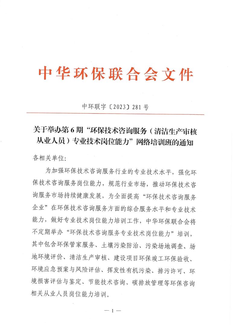 关于举办第6期“环保技术咨询服务(清洁生产审核从业人员)专业技术岗位能力”网络培训班的通知