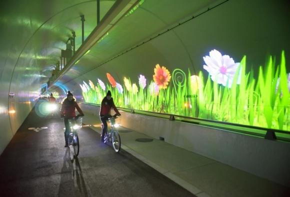图片说明:在法国里昂Croix Rousse2号隧道中骑行的人们。