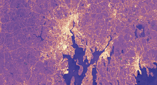 美国东北部罗得岛州普罗维登斯市区和周边地区的温差。(自美国航空航天局)