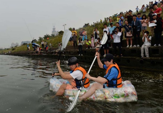 韩大学生坐“薯片救生筏”渡江 反对食品袋充气过多 (网页截图)