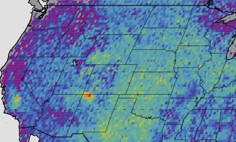 位于地图四个角落的地区(红色标记)是美国甲烷排放的聚集区。该图显示的是2003年至2009年间甲烷排放的平均浓度变化。(深色表示低于平均值;亮色表示高于平均值)