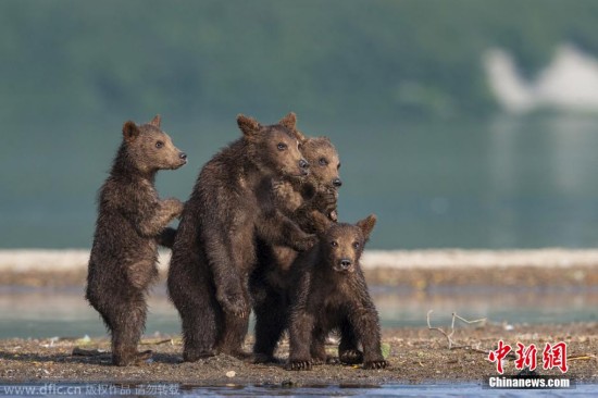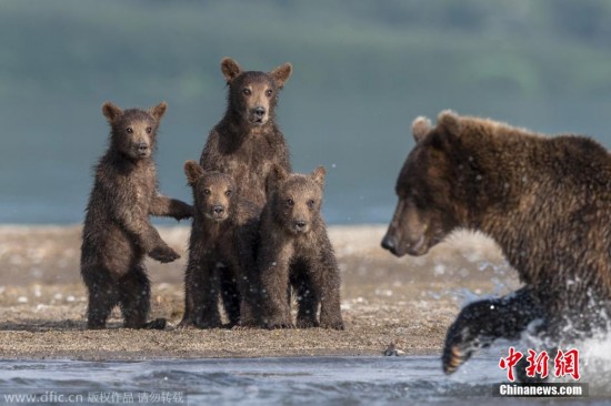 当地时间2015年1月28日报道,俄罗斯千岛湖,53岁的摄影师Sergey Ivanov拍摄到四头熊宝宝在岸边观看爸爸奋力捕鱼的场景,样子非常有爱。图片来源:东方IC 版权作品 请勿转载