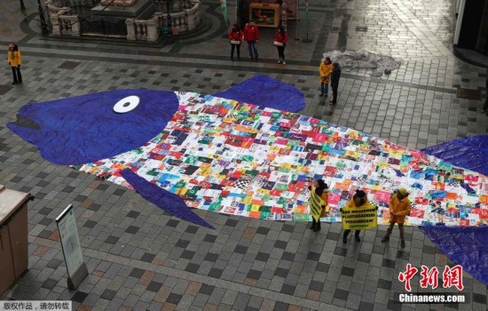 奥地利环保人士用购物袋拼巨形鱼 抗议海洋污染